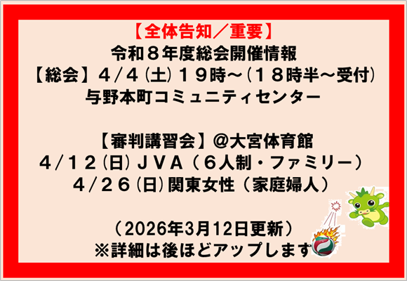 続きを読む2025/10/29 大会結果をアップしました。 2025年10月13日(月)に開催されました『秋季YOUリーグ(6人制一般男女の部)』の大会結果をお知らせします。 ※その他の写真は追って追加します